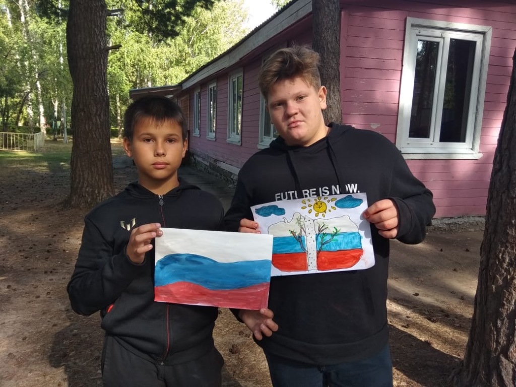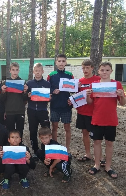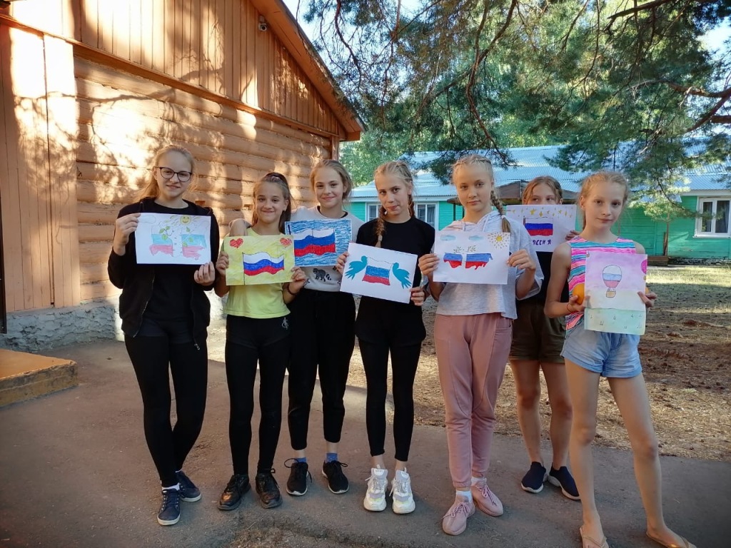 С самого утра в лагере звучали песни о России, и отряд за отрядом принимал участие в запланированных активностях: торжественная тематическая линейка,выставка рисунков и эмблем «Наш российский триколор»,презентация «История флага российского», флешмоб «Под Флагом России».