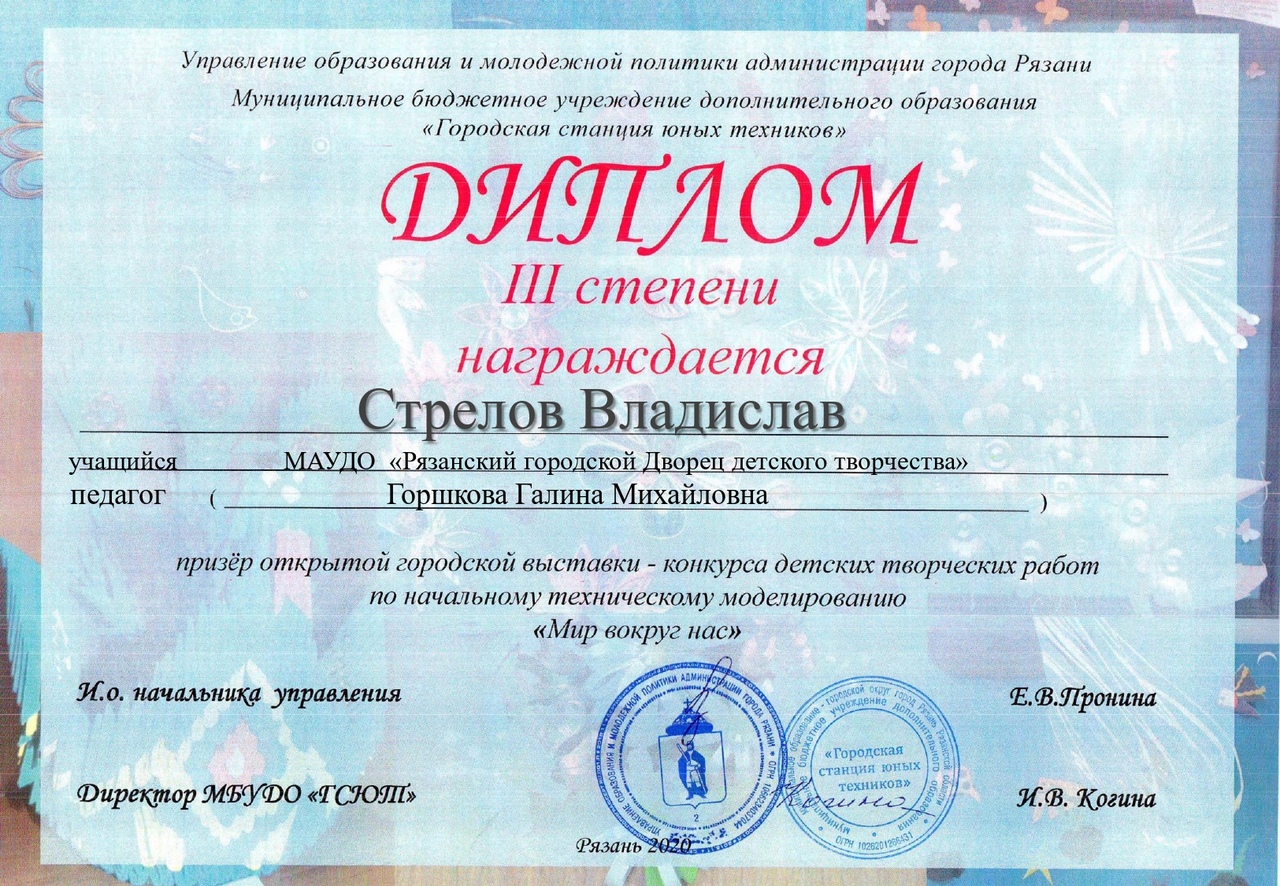 Учащиеся объединения "Начальное техническое моделирование" приняли участие в открытой городской выставке-конкурсе детских творческих работ по начальному техническому моделированию «Мир вокруг нас». Ребята представили несколько различных моделей, выполненных из бумаги и картона. По результатам выставки-конкурса один из учащихся, Стрелов Владислав, занял 3 место. Остальные юные техники были награждены дипломами участников. Мы уверены, наши большие победы - впереди! Пусть этот конкурс станет стартовой площадкой для наших будущих достижениий! Всех поздравляем, благодарим за активность, инициативу, участие и желаем дальнейших творческих успехов и побед!