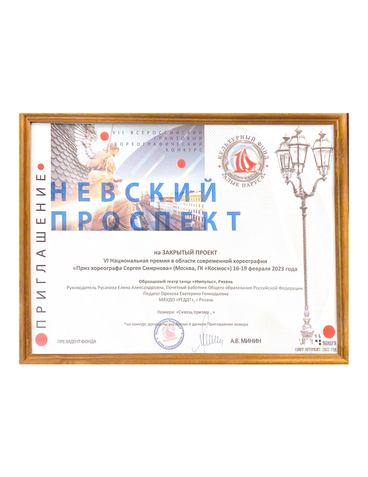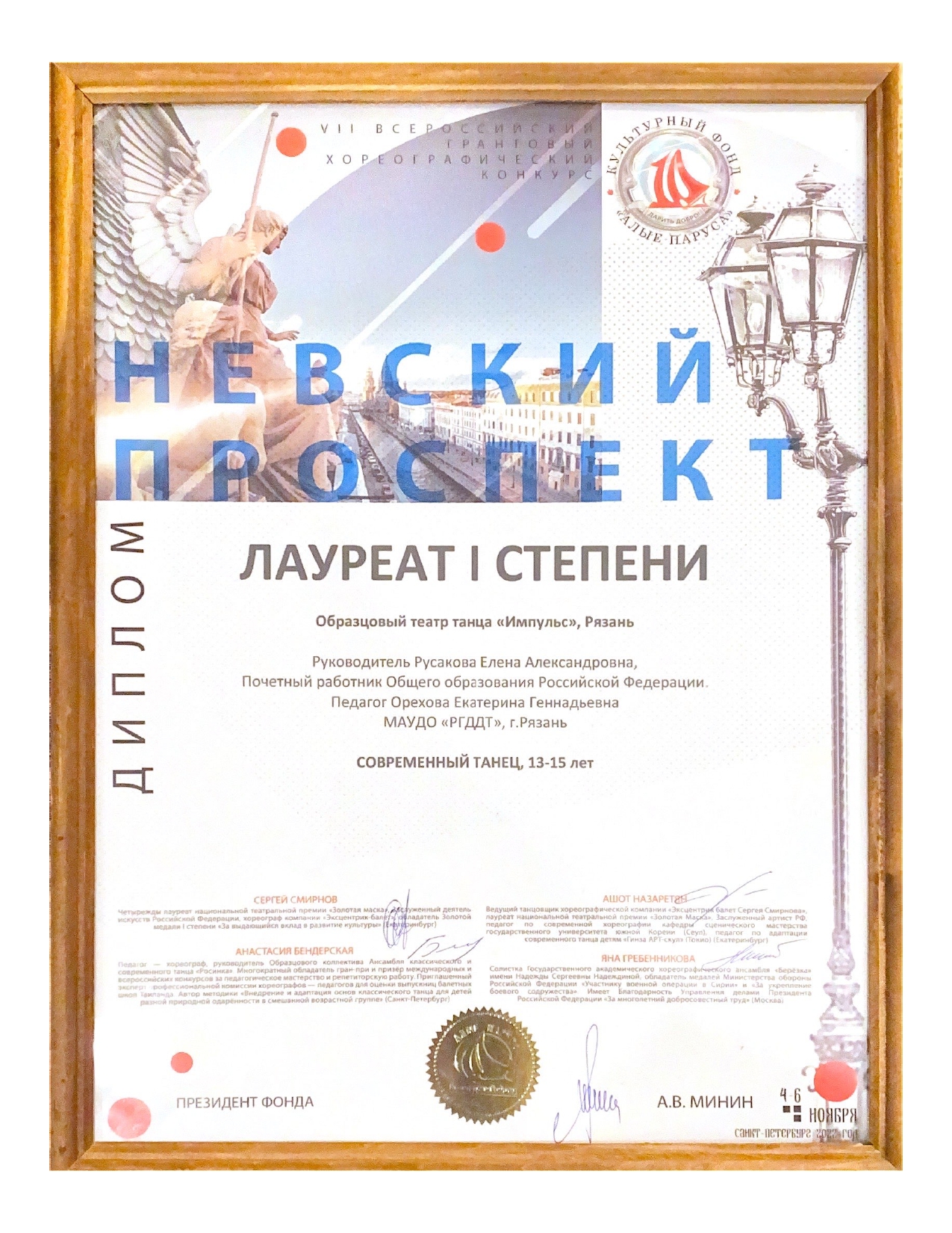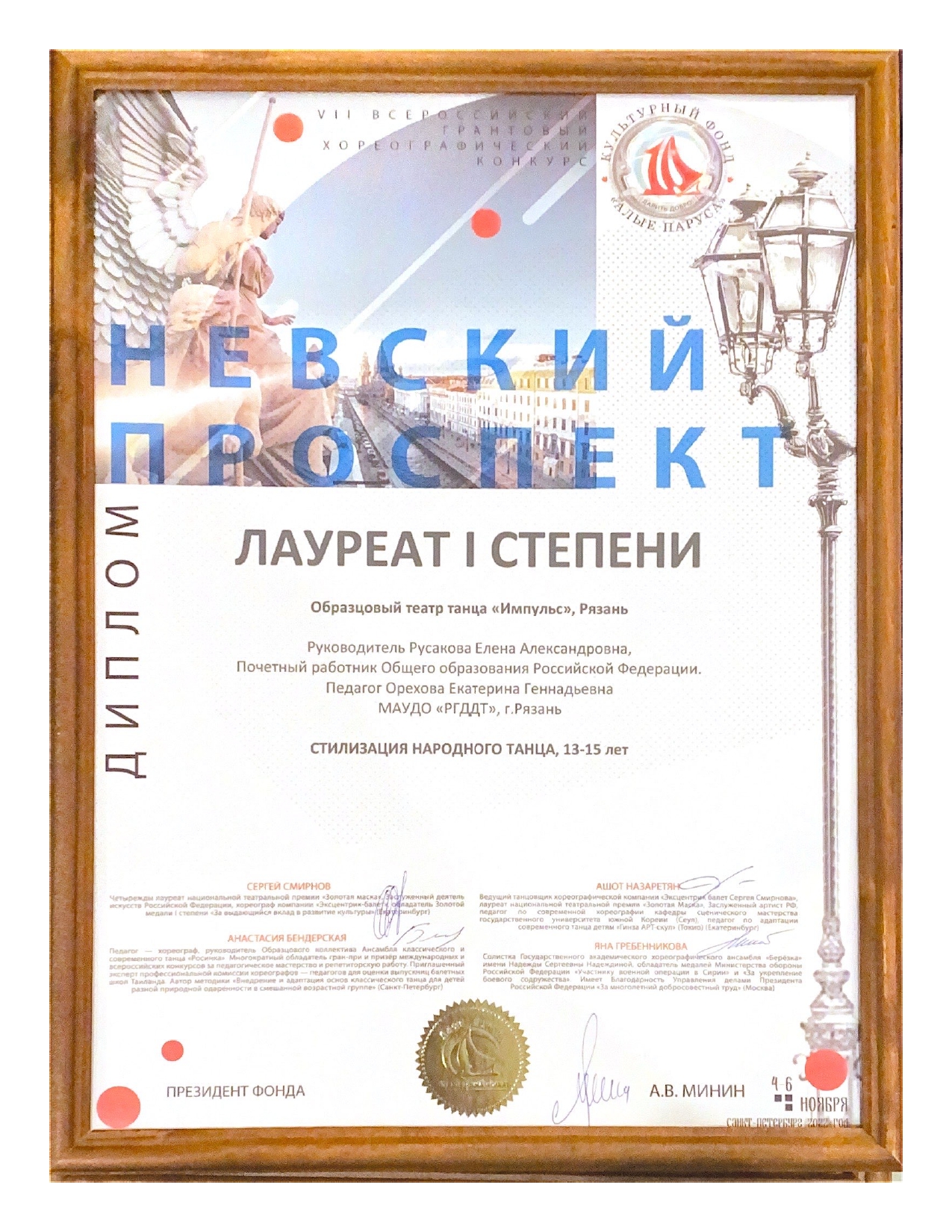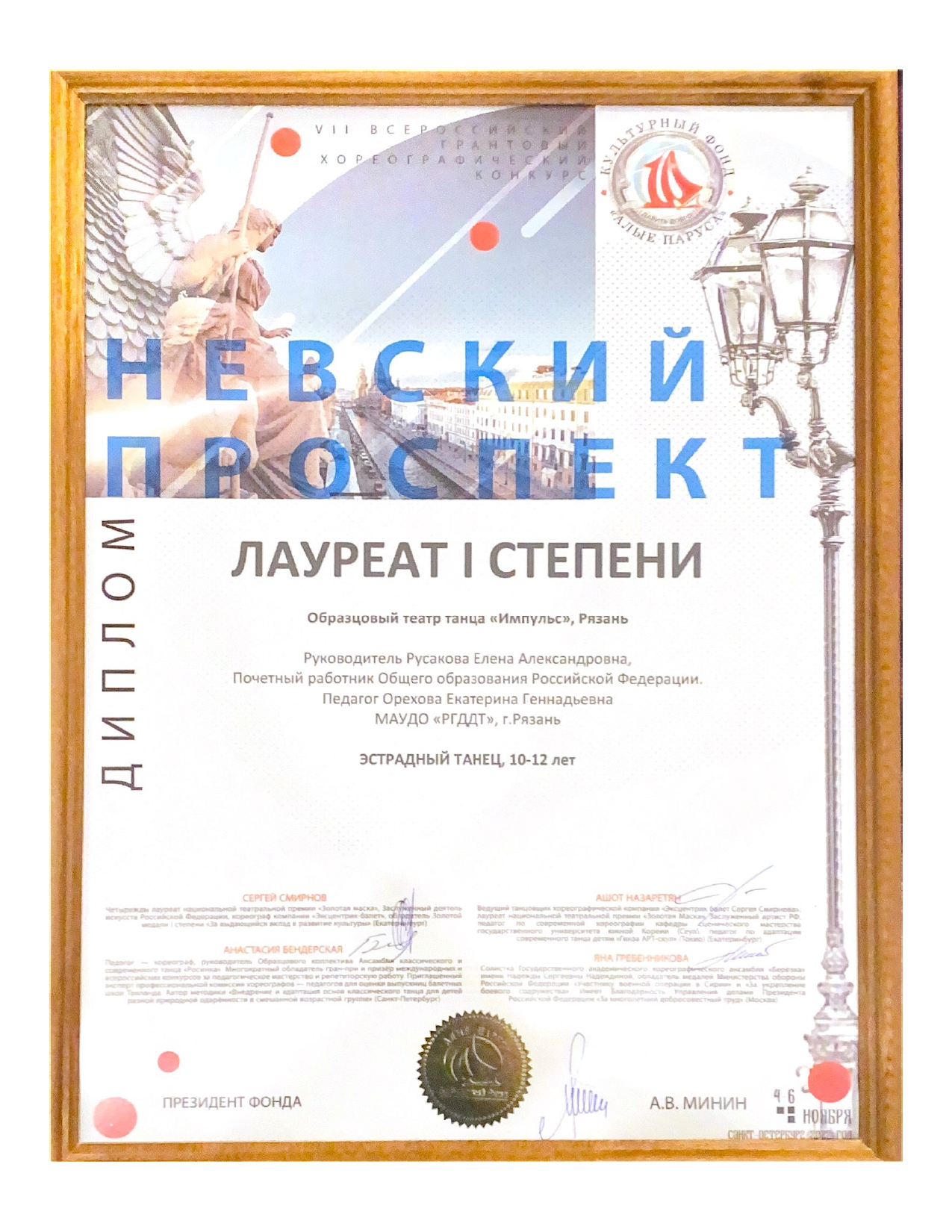 На «Невский проспект» приехали участники из Чистополя, Перми, Ярославля, Казани, Кирова, Сочи, Архангельска, Зеленограда, Нижнекамска, Твери, Астрахани, Ленинградской области и других городов. Рязань представлял Образцовый театр танца «Импульс». Ребята старшей и средней групп коллектива представили программу из 6 номеров на суд компетентного жюри, в состав которого входили Анастасия Бендерская, Яна Гребенникова, Сергей Смирнов и Ашот Назаретян. Мастерство наших участников по достоинству оценили судьи.