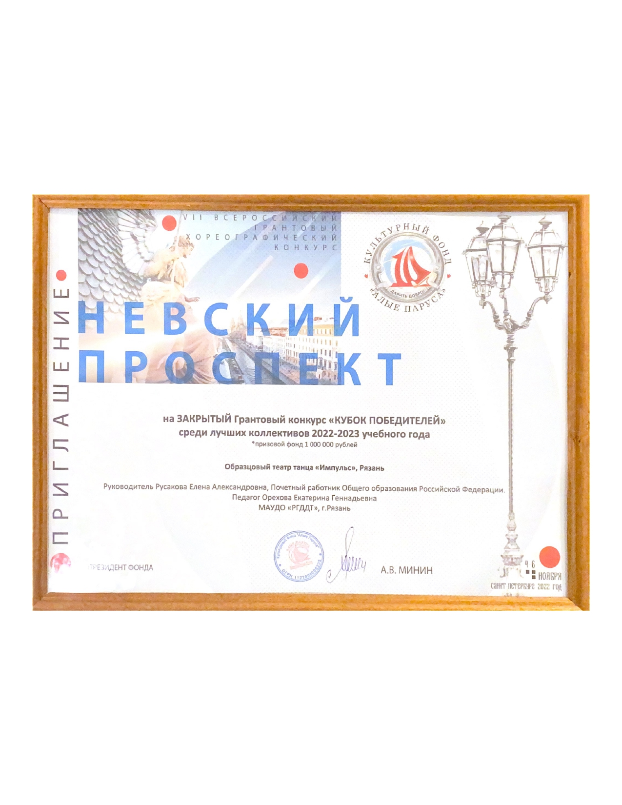 Коллектив стал Лауреатом I степени в номинации «Современный танец 13-15 лет», Лауреатом I степени в номинации «Народно-стилизованный танец 13-15 лет», Лауреатом I степени в номинации «Эстрадный танец 10-12 лет». Театр танца «Импульс» получил приглашение на ЗАКРЫТЫЙ Грантовый конкурс «Кубок Победителей» среди лучших коллективов 2022-2023 уч. года с призовым фондом 1000000 рублей и приглашение на ЗАКРЫТЫЙ ПРОЕКТ VI НАЦИОНАЛЬНАЯ ПРЕМИЯ в области СОВРЕМЕННОЙ ХОРЕОГРАФИИ. Свои награды получили и руководители, и каждый участник коллектива – личную грамоту!
