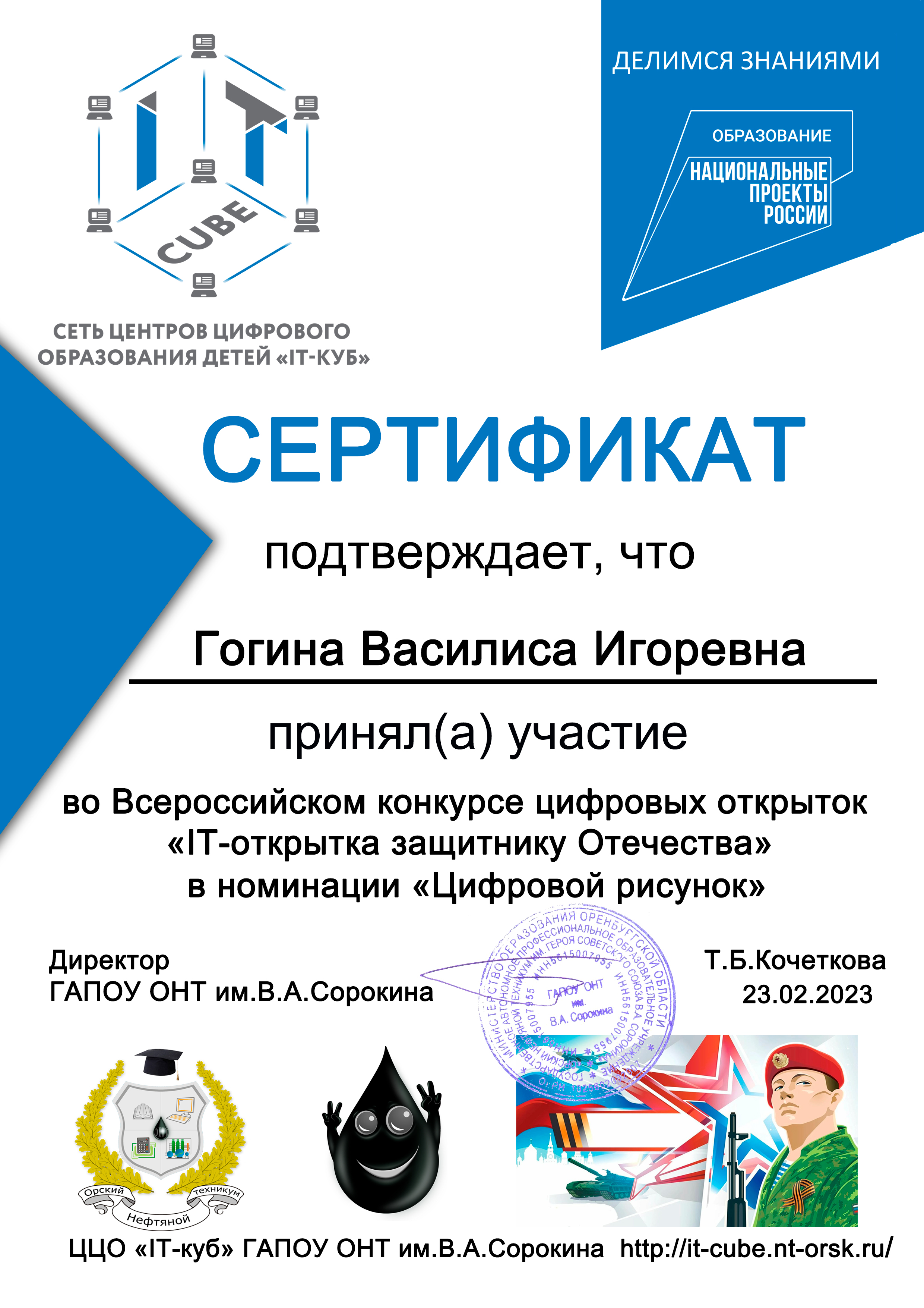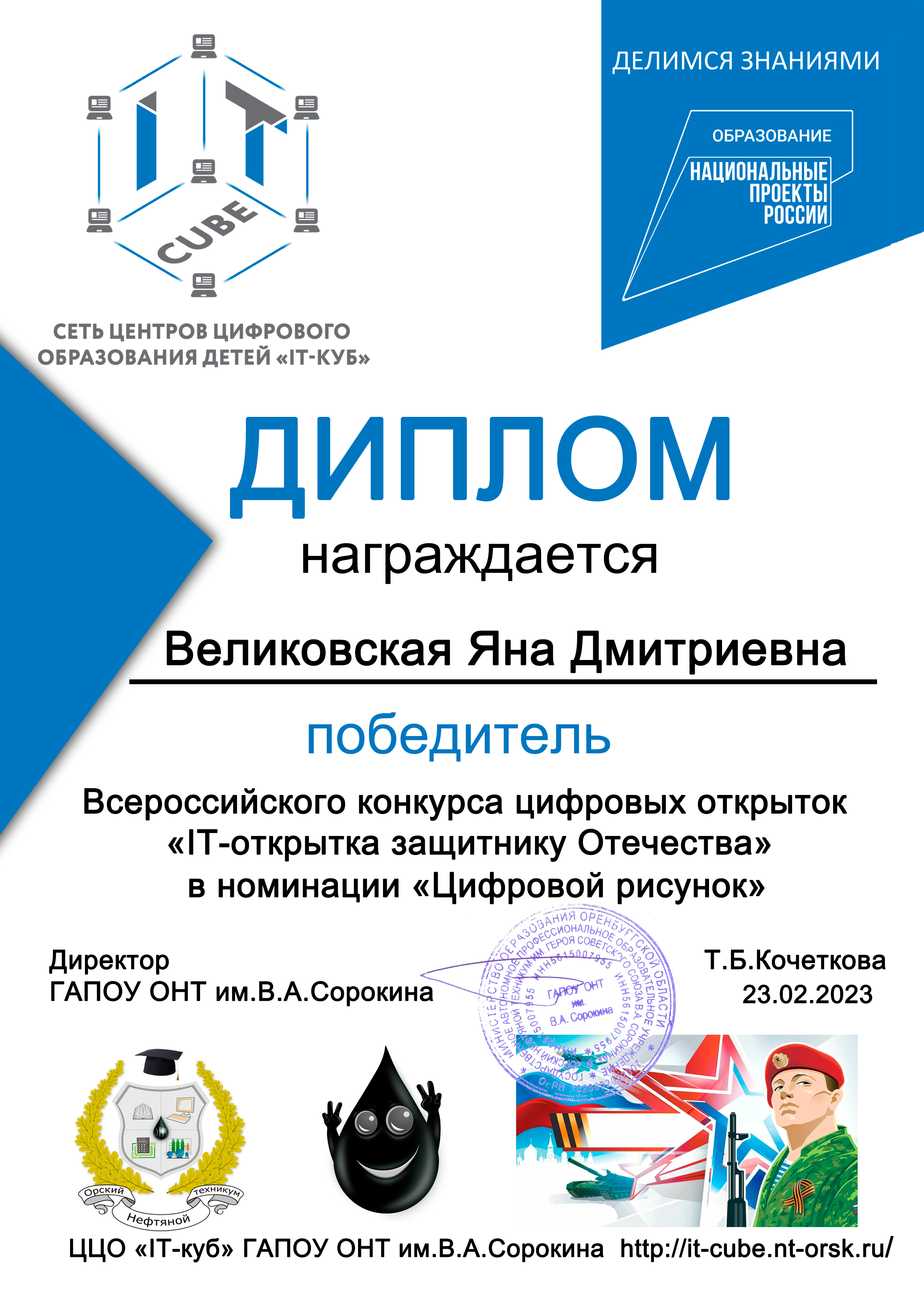 В течение февраля проходил Всероссийский конкурс цифровых открыток "IT-открытка защитнику Отечества", организатором которого в Рязанской области является сеть Центров цифрового образования детей «IT-КУБ». Десять обучающиеся «Школы компьютерных знаний» (педагог Королева Е.А.) подготовили конкурсные работы, шесть из которых удостоились призовых мест. Абсолютными победителями признаны Великовская Яна и Ермакова Таисия.