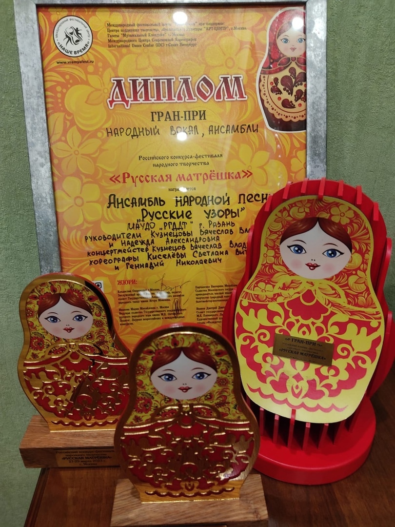 По итогам конкурсных программ ансамбль «Русские узоры» стал обладателем ГРАН-ПРИ конкурса-фестиваля «Русская матрёшка» в номинации «Народный вокал, ансамбли» и получил Призовой сертификат на участие в конкурсе искусства в октябре 2023 года в городе Сочи.
