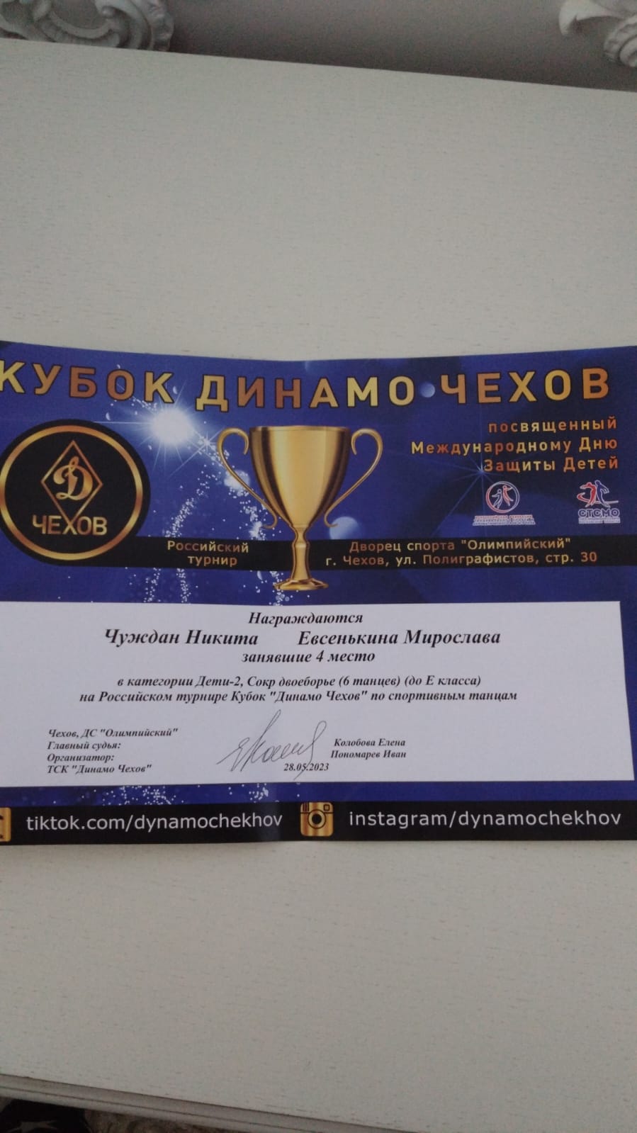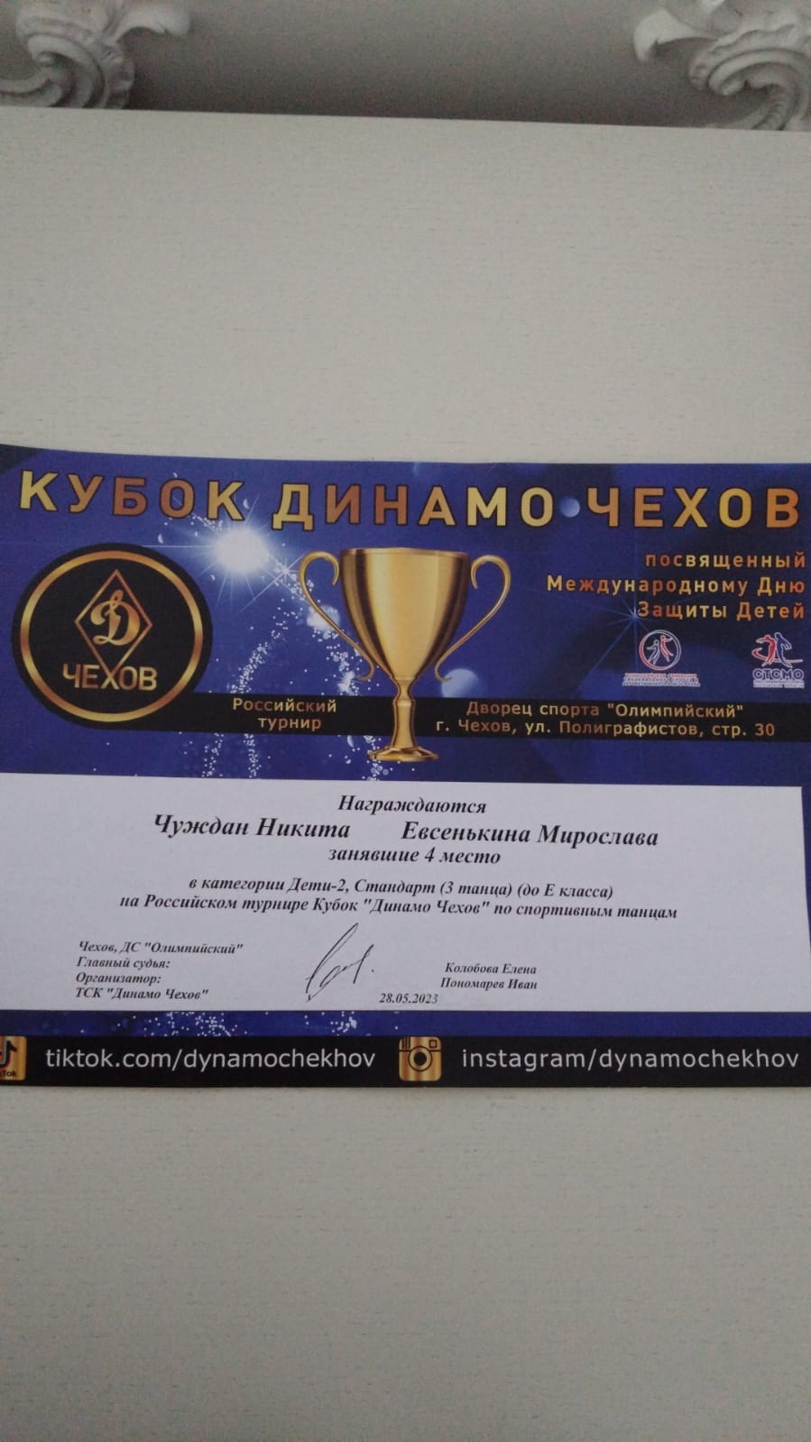 29 мая 2023 года в г. Чехов Московской области состоялось Российское соревнование по танцевальному спорту КУБОК ДИНАМО ЧЕХОВ. Танцевально-спортивный клуб «Солнечные ритмы» показал достойные результаты.