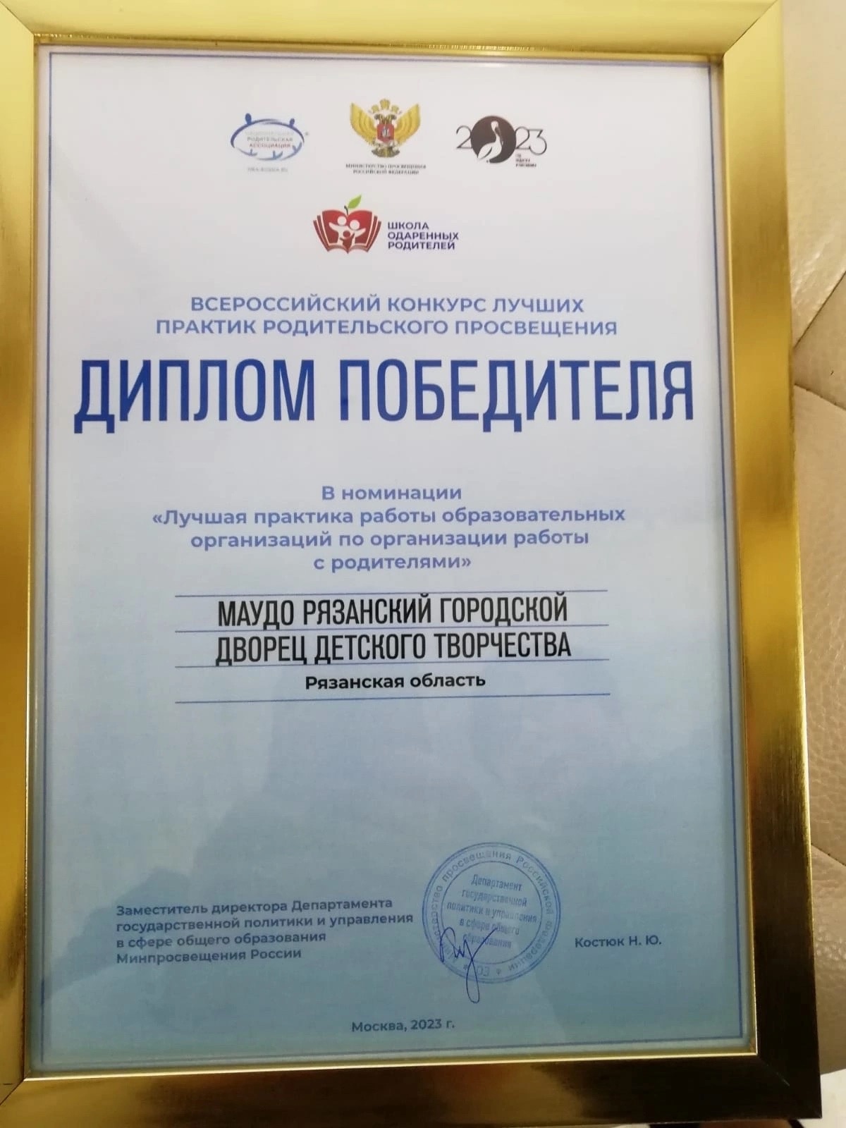 Проект «Семья и Дворец - сотрудничество, сотворчество, содружество», подготовленный командой в составе Пыжонковой Т.Е, директора МАУДО «РГДДТ», Филимоновой И.В., заместителя по УВР, Мироновой Н.В., старшего методиста, Паршиной Н.В., педагога-психолога, в номинации «Лучшая практика работы образовательных организаций по организации работы с родителями», в которой было заявлено 192 участника из 44 субъектов, признан победителем!
