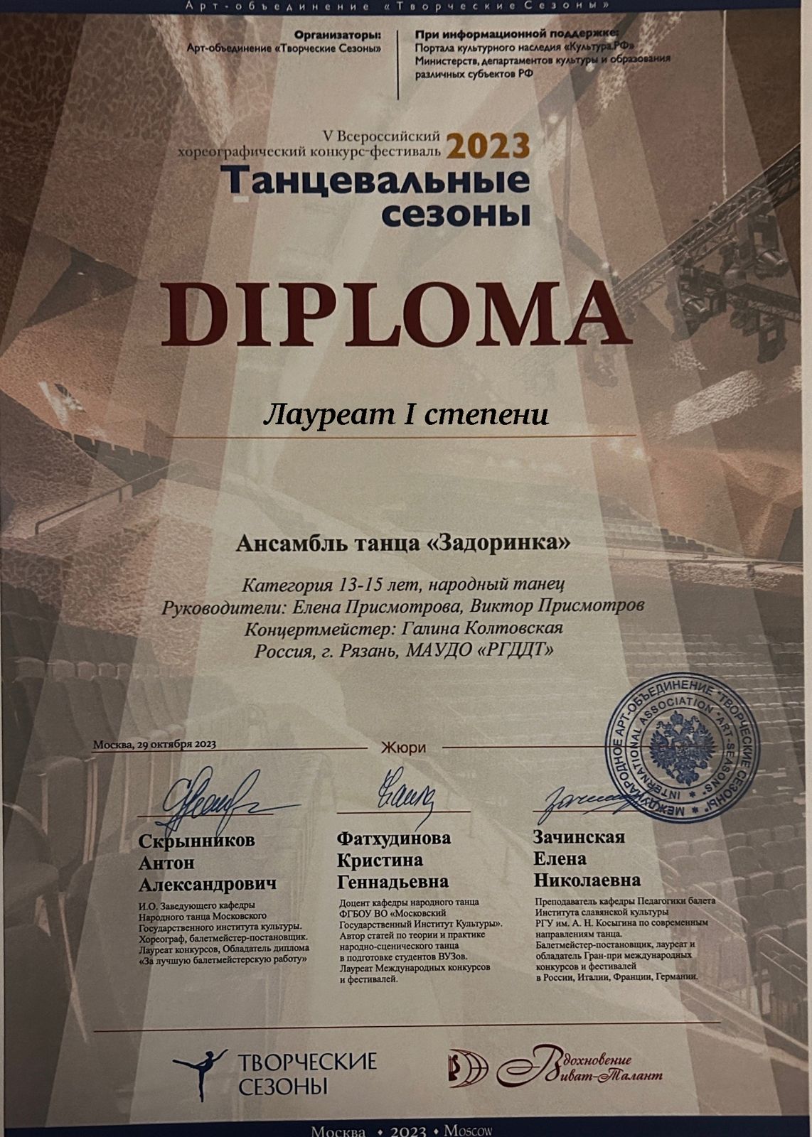 29 октября в г. Москва Образцовый ансамбль танца «Задоринка» Рязанского городского Дворца детского творчества принял участие в V Всероссийском хореографическом конкурсе «Танцевальные сезоны», организованном Арт-объединением «Творческие сезоны» при информационной поддержке портала культурного наследия «Культура РФ».