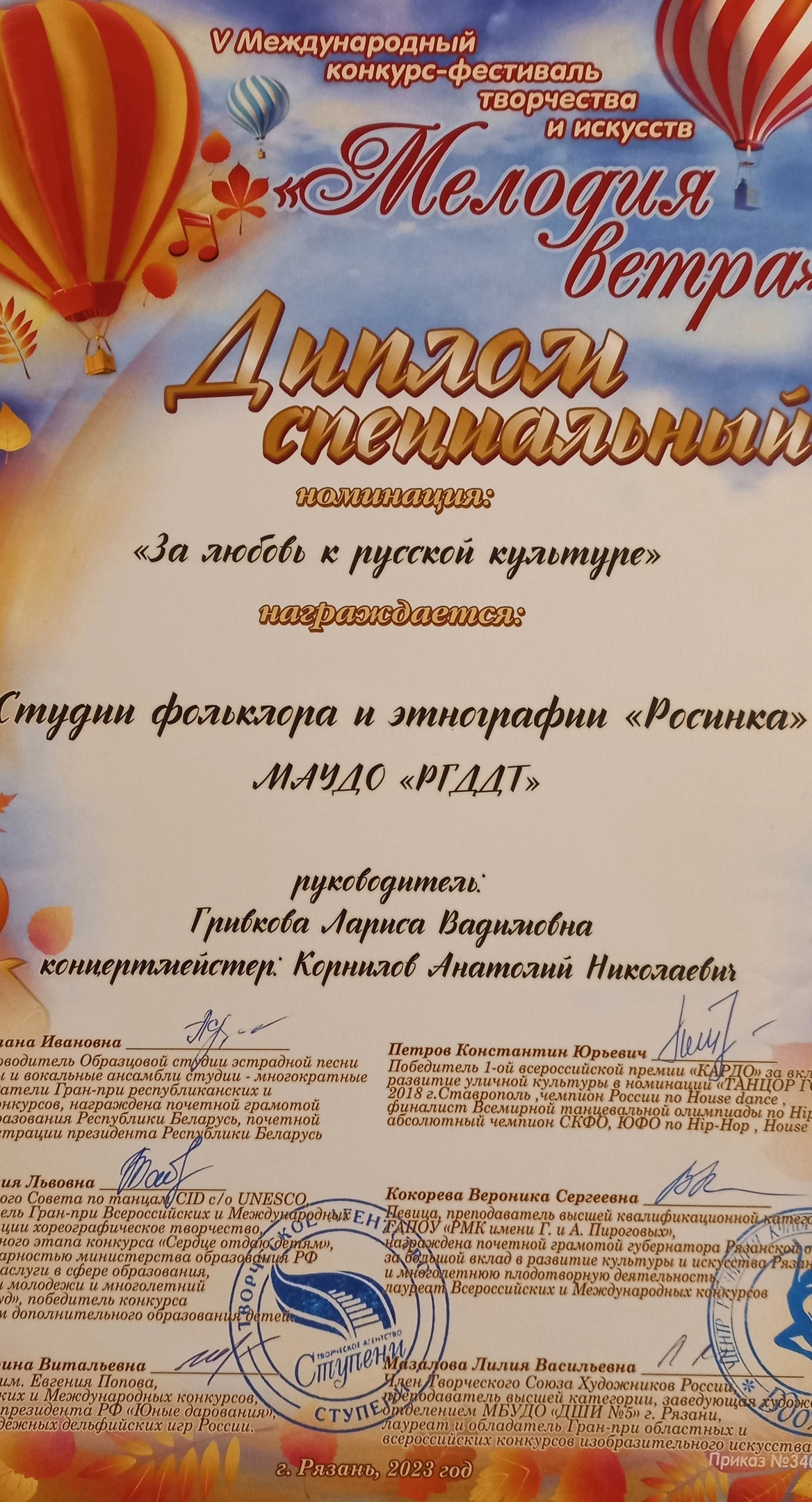 29 октября 2023 г. студия фольклора и этнографии «Росинка» (педагог Л.В. Гривкова, концертмейстер А.Н. Корнилов) Рязанского городского Дворца детского творчества приняла участие в V Международном конкурсе-фестивале творчества и искусств «Мелодия ветра», который проходил в Студенческом Дворце культуры Рязанского государственного агротехнологического университета имени П.А. Костычева.