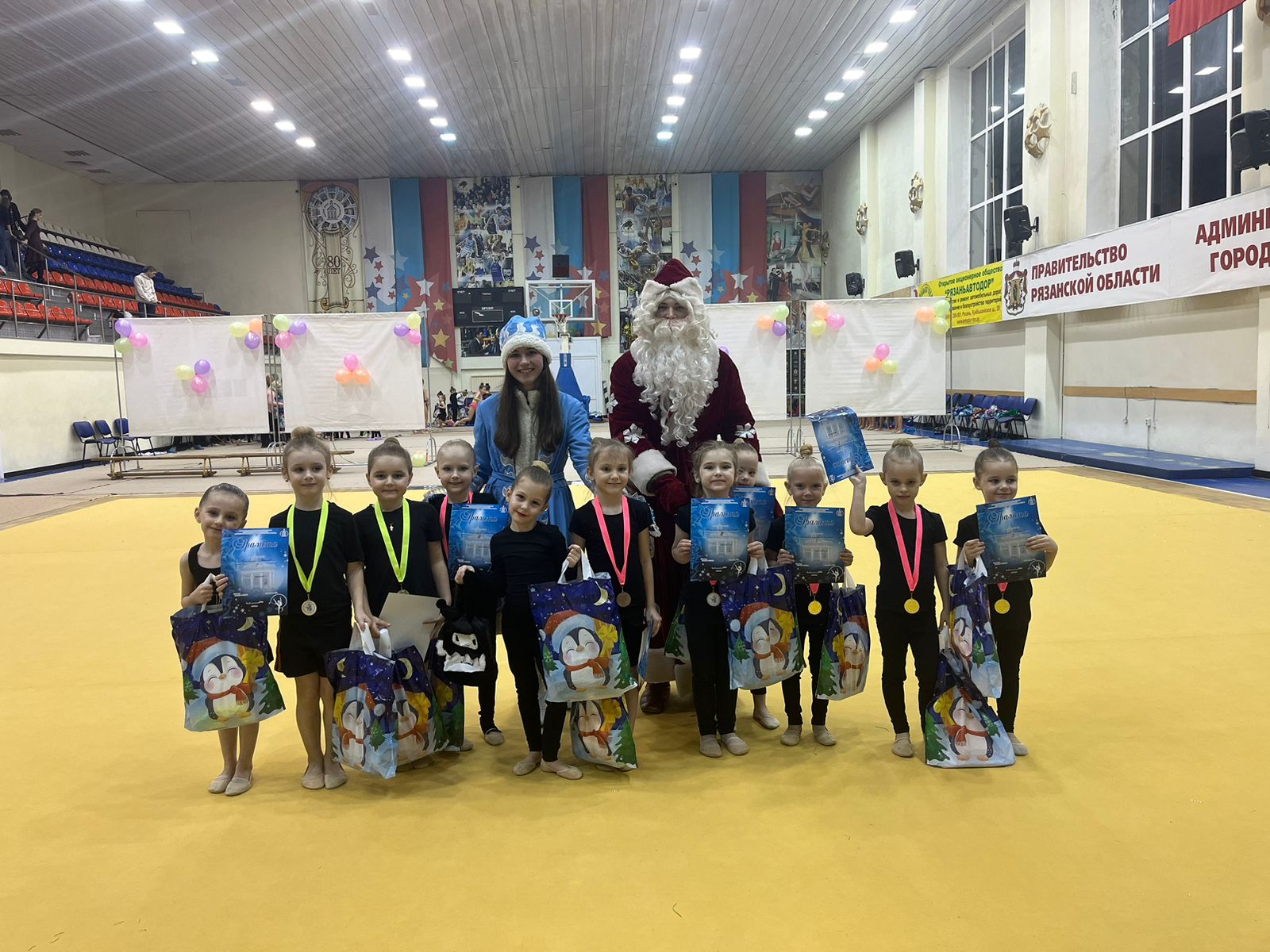 Более 150 гимнасток приняли участие в соревнованиях. Настроили на нужный лад и подарили атмосферу праздника соревнующимся Дед Мороз со Снегурочкой и зайчишка Стёпа.