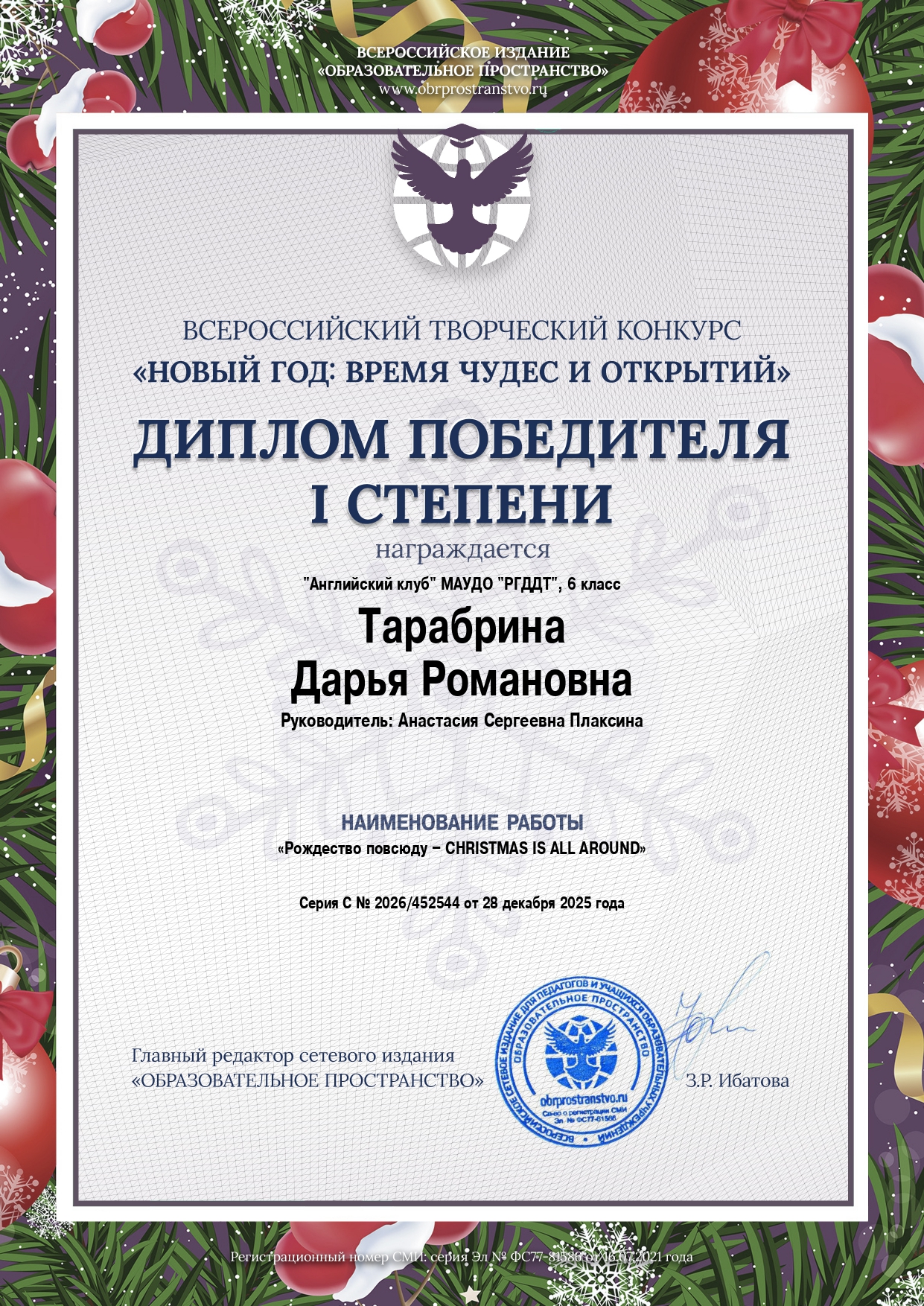 Во Всероссийском творческом конкурсе «Новый год – время чудес и открытий» с работой «Рождество повсюду» обладателем диплома I степени стала Тарабрина Дарья.