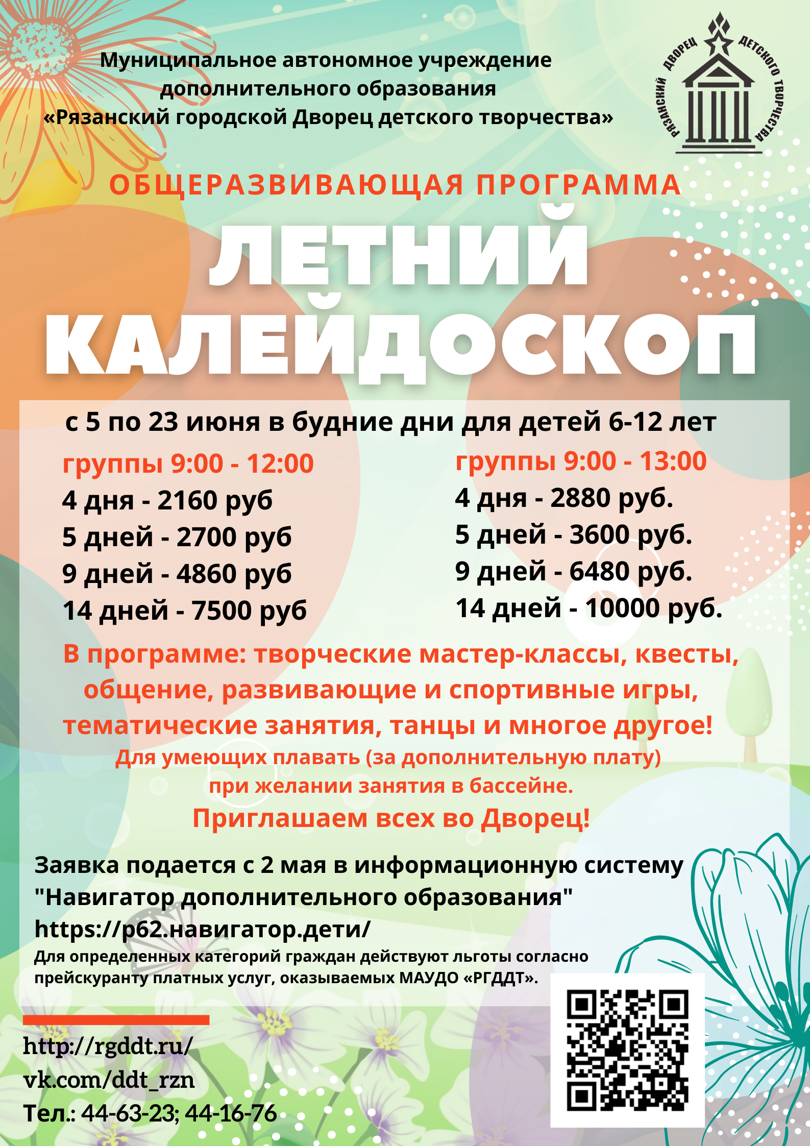 Занятия будут проводиться опытными педагогами дополнительного образования с 09.00 до 13.00 в аудиториях МАУДО «РГДДТ», отвечающих санитарно-гигиеническим нормам, а также на территории Верхнего парка Дворца по адресу: г. Рязань, ул. Есенина д.46